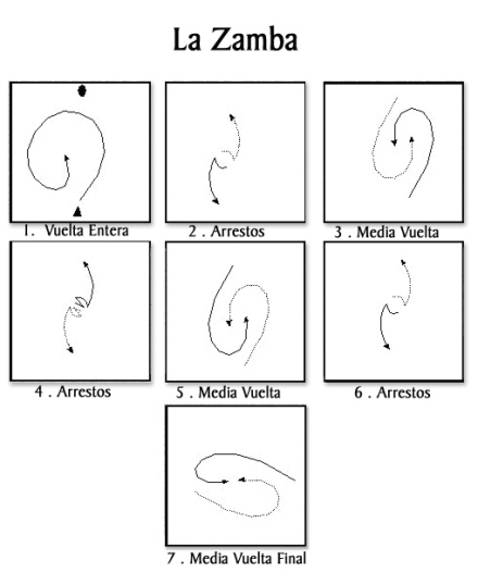 - Media Vuelta: 8 pasos, con pañuelo, yendo al centro. Salen con el pie izquierdo y describen la media vuelta en 2 series de 4 pasos cada una.